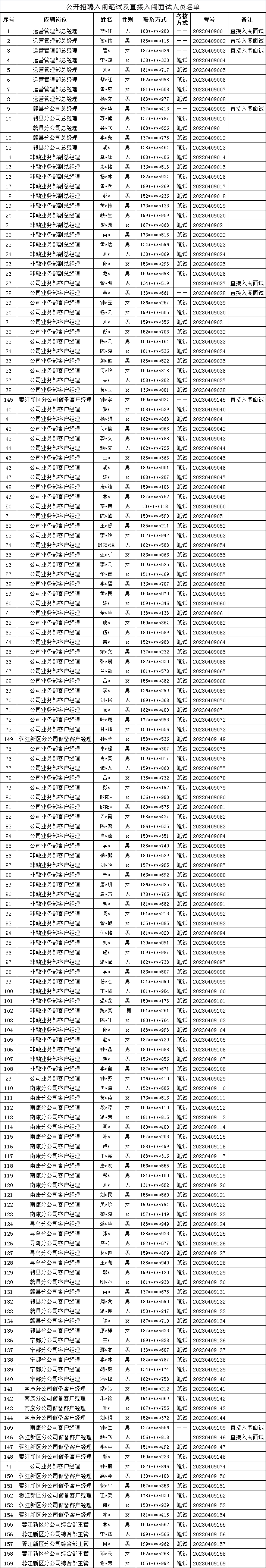 根據(jù)集團(tuán)公司招聘公告的相關(guān)規(guī)定和程序,經(jīng)過報(bào)名、資格審查等工作,現(xiàn)將本次招聘入闈筆試、直接入闈面試人員名單未進(jìn)入筆試的人員不另行通知)及有關(guān)事項(xiàng)公告如下: