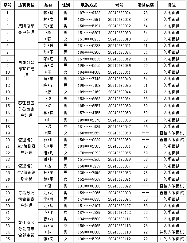 根據(jù)集團(tuán)公司招聘公告的相關(guān)規(guī)定和程序,經(jīng)過報(bào)名、資格審查、筆試等工作,現(xiàn)將本次招聘入闈面試人員名單未達(dá)到面試條件的不另行通知及有關(guān)事項(xiàng)公告如下: